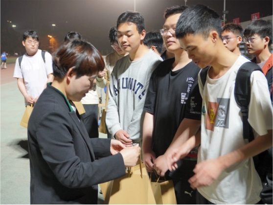 姬国斌、倪凤英向运动员代表们发放慰问品,并与同学们一一交流,为大家加油打气。一份份慰问品,从老师手里递到同学们手中,这不仅是一份心意的传递,更是学院凝聚力的体现。