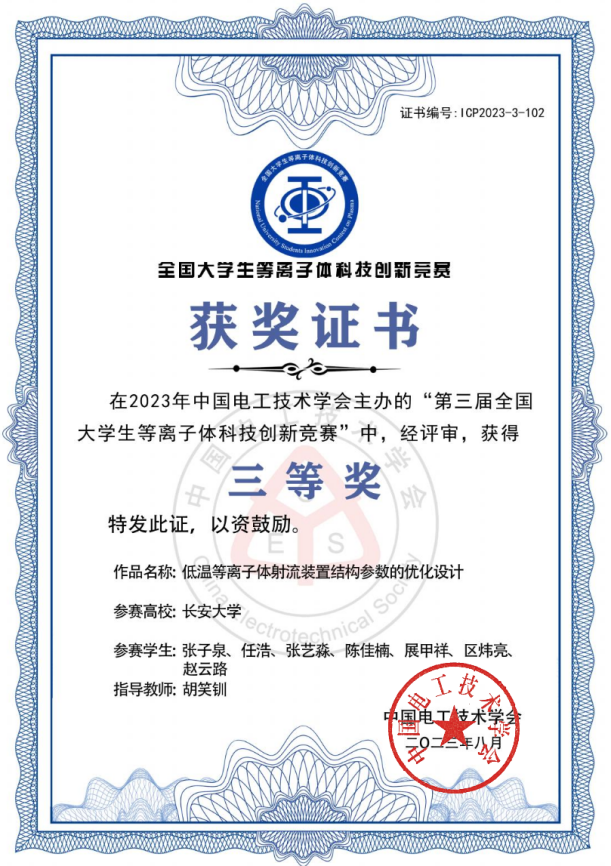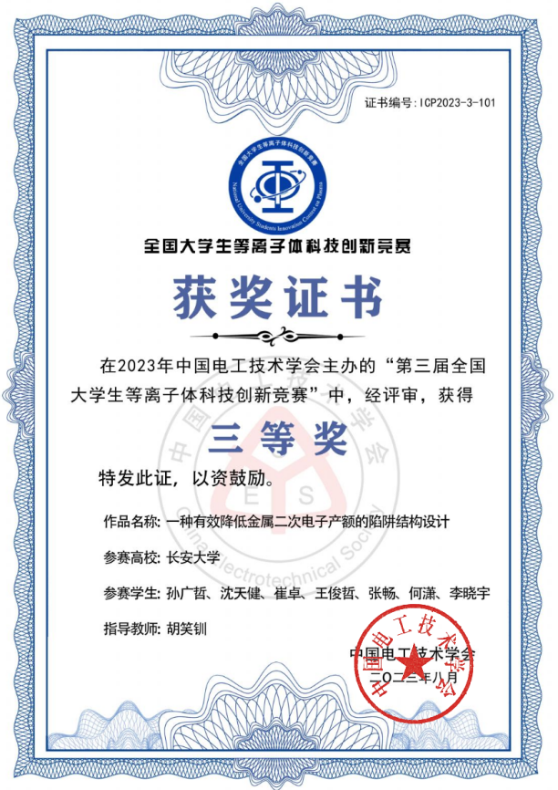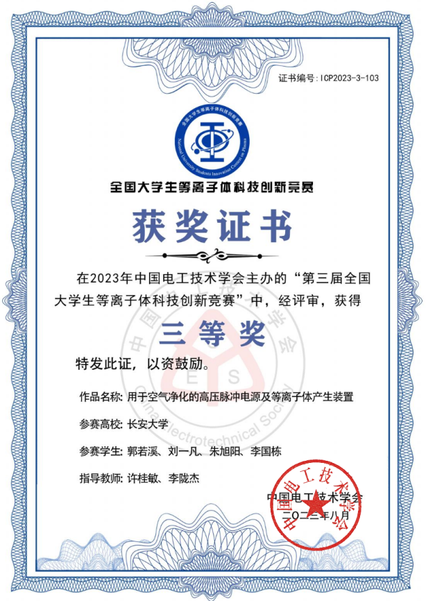 由中国电工技术学会主办的第三届全国大学生等离子体科技创新竞赛决赛于2023年8月在武汉顺利举办。竞赛自2023年4月20日启动以来,共收到全国90余所高校和科研院所的350多件参赛作品。经过严格的网络评审,共遴选出140件作品进入决赛。beat365在线唯一官网学生刘样溪、张子泉、孙广哲等人在胡笑钏、许桂敏老师的指导下,经过严格的网络评审、现场评审和答辩评审环节,最终斩获全国二等奖1项、三等奖3项。