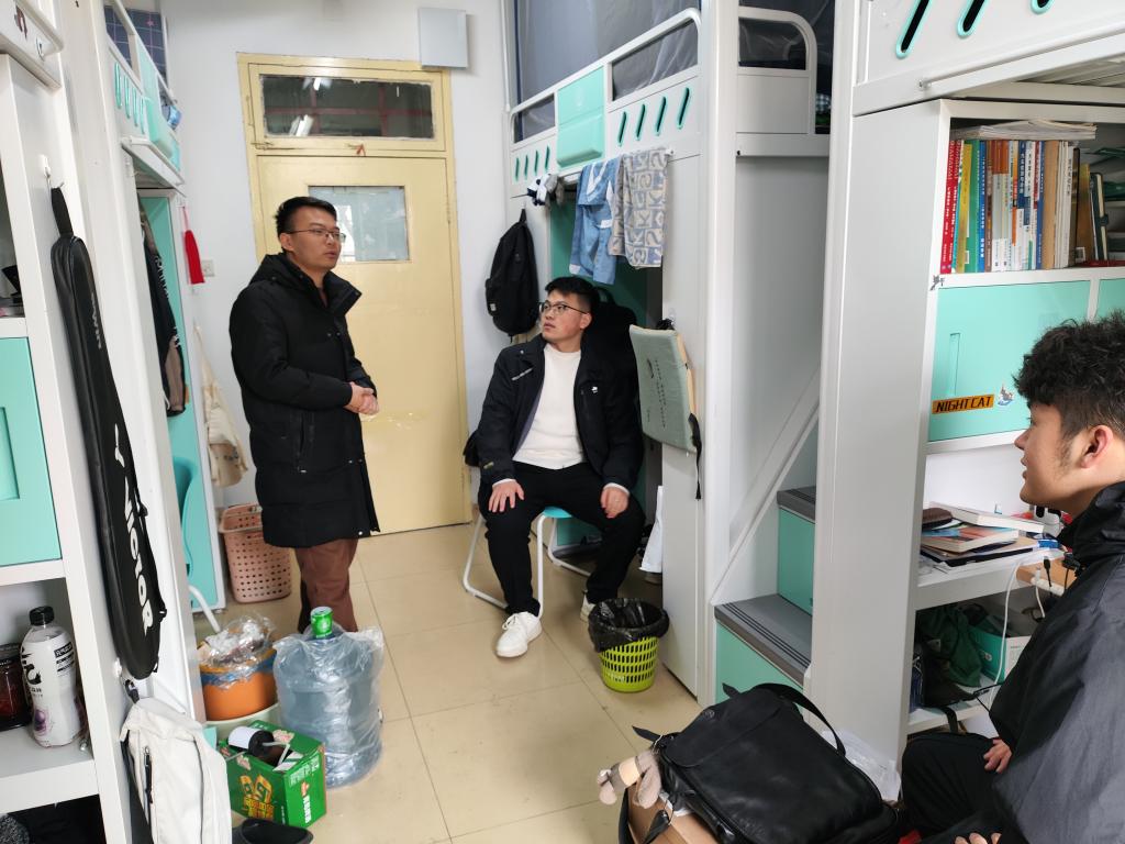 学院院长陈昊、党委副书记倪凤英带队前往学生宿舍进行走访调研,了解学生假期学生生活情况、考研成绩及求职情况,询问学生新学期规划,掌握学生思想动态。陈昊院长鼓励同学们在新学期伊始要及时调整学习状态、聚焦学业主业,营造和谐、积极、团结的宿舍氛围。