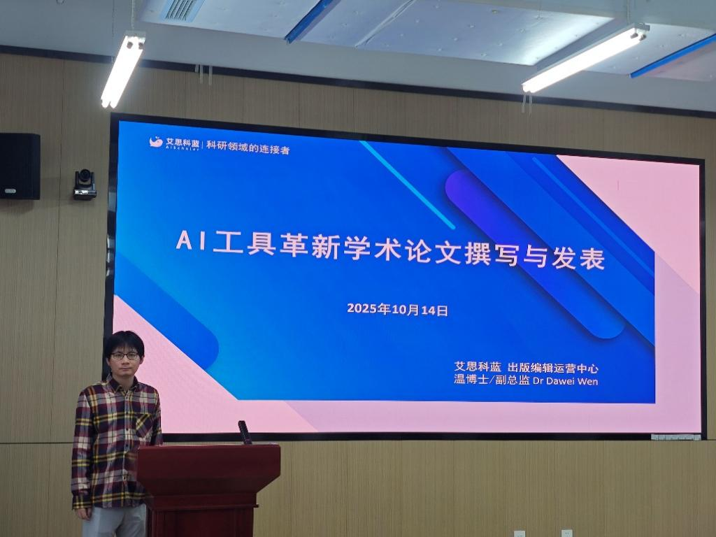 为积极响应国家关于人工智能赋能教育发展的战略部署,引导师生科学、高效地运用智能工具,10月14日下午,beat365在线唯一官网在612会议室举办了以“AI工具革新学术论文撰写与发表”为主题的讲座,艾思科蓝出版编辑部温大尉总监担任主讲。讲座由副院长徐先峰主持。
