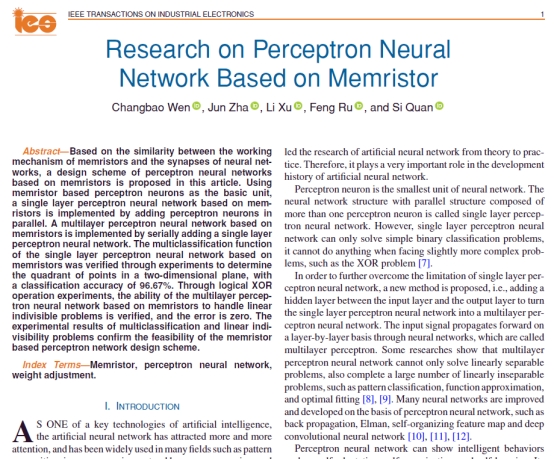 beat365官网电气工程及其自动化系教师文常保教授以第一作者身份在电子与电气工程领域TOP期刊《IEEE Transactions On Industrial Electronics》上发表了题为《Research on Perceptron Neural Network Based on Memristor》的研究论文,论文第一署名单位为长安大学beat365在线唯一官网。