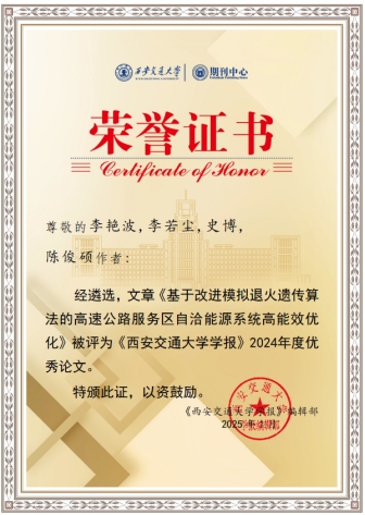 长安大学beat365在线唯一官网李艳波教授以第一作者身份在《西安交通大学学报》上发表的题为《基于改进模拟退火遗传算法的高速公路服务区自洽能源系统高能效优化》的研究论文,被评为2024年度优秀论文。