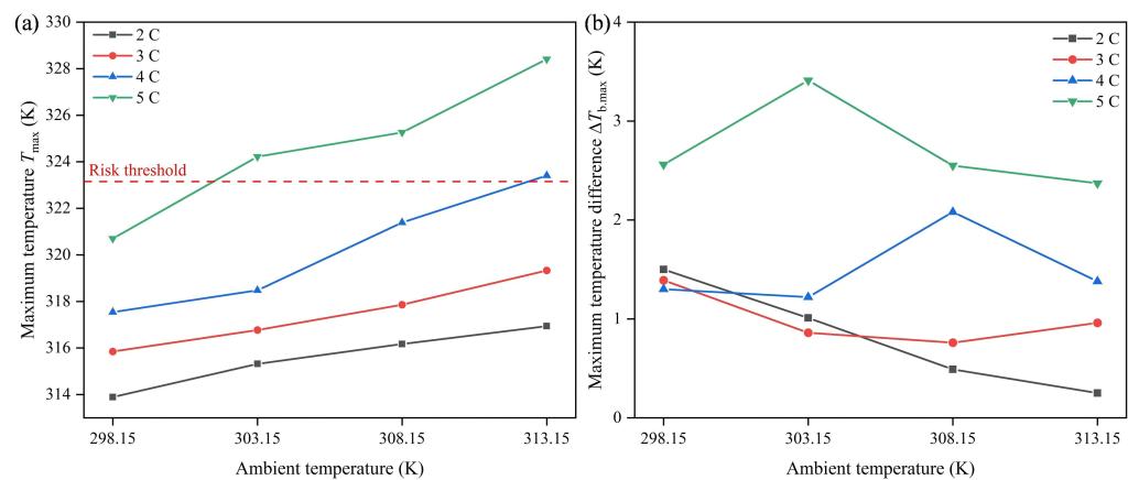 (a)不同放电倍率和环境温度下的最高电池温度和(b)最大电池温差