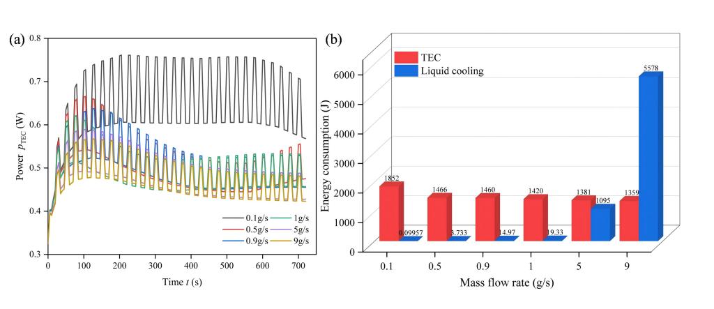 不同质量流速下,(a)TEC的输入功率和(b)TEC和液体冷却的能耗