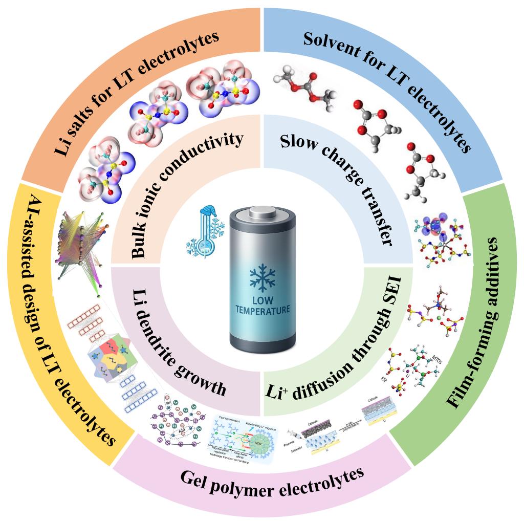 锂离子电池以其高能量密度和出色的循环稳定性而闻名,已成为最常见的储能技术之一。然而,在低温条件下,容量衰减、倍率性能下降和锂枝晶生长等问题严重阻碍了其应用。因此,迫切需要对锂离子电池的低温特性有更全面和系统的了解。研究团队系统评述了提升锂离子电池低温性能的电解质工程策略研究进展。通过分析揭示了四大关键性能限制机制:低温环境下的离子电导率不足、受动力学约束的电荷转移过程、锂离子跨固体电解质界面膜的传输受限以及不可控的锂枝晶生长。重点阐述了创新优化方法,包括具有解离特性调控功能的锂盐分子设计、基于介电常数/粘度协同优化的溶剂基质构建、低阻抗SEI膜构筑的界面工程添加剂以及凝胶-聚合物复合电解质体系。特别强调新兴的机器学习引导策略,通过组分组合的高通量虚拟筛选和构效关系预测模型,建立了定量化的组分-性能关联机制。这些人工智能辅助的设计框架,借助先进的数据驱动方法,为加速开发新一代低温电解质提供了重要技术路径。