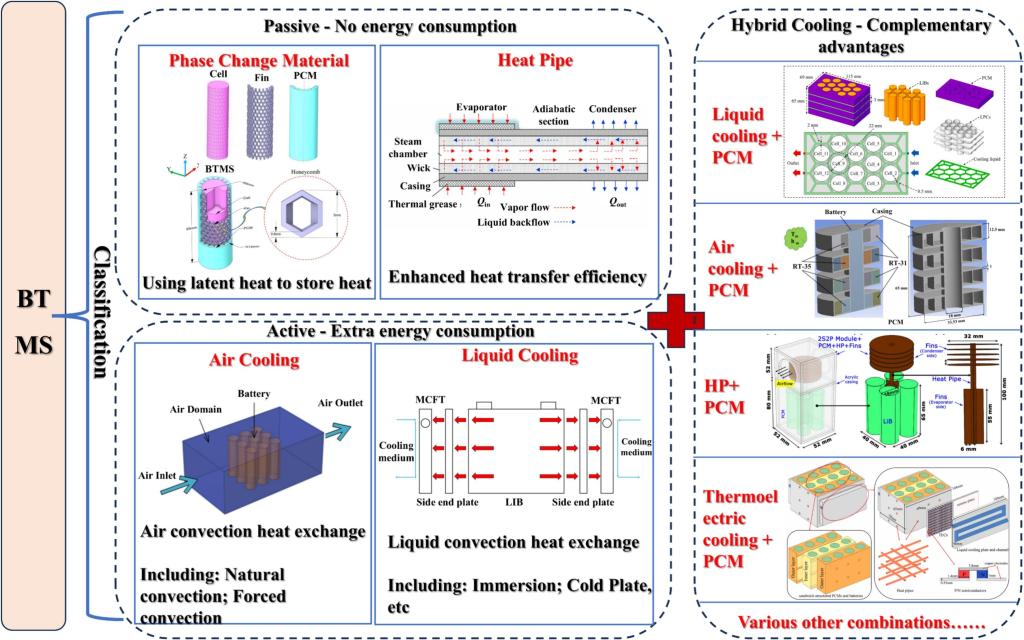 该研究针对电动汽车和固定式储能系统快速发展带来的锂离子电池热安全性和性能可靠性挑战,将电池热管理系统(BTMS)视为保障其稳定运行的关键。该综述系统梳理了BTMS的最新进展,将其系统地划分为被动冷却、主动冷却和混合冷却三大类。论文详细分析了各类技术的优势与应用局限:被动策略(如热管、相变材料)具有结构简单、无需额外能耗的优点,但在高热流密度和动态负载下,因其固有的低热导率和响应速度限制了散热能力。主动策略(如空冷、液冷、热电冷却)可实现高效且可控的散热,但通常会增加系统复杂性和能量消耗。混合冷却系统(如PCM-HP、液冷-PCM、PCM-TEC等)是目前最有前景的研究方向。通过结构优化集成和协同控制策略,混合系统能够显著提高电池温度均匀性、瞬态热响应速度和系统安全冗余度,有效应对复杂的运行环境。最后,论文展望了BTMS的未来发展趋势,包括数据驱动的热控制、多功能材料集成和结构协同设计等前沿方向,为下一代智能和自适应电池热管理系统的研发提供了宝贵的理论指导和工程参考。