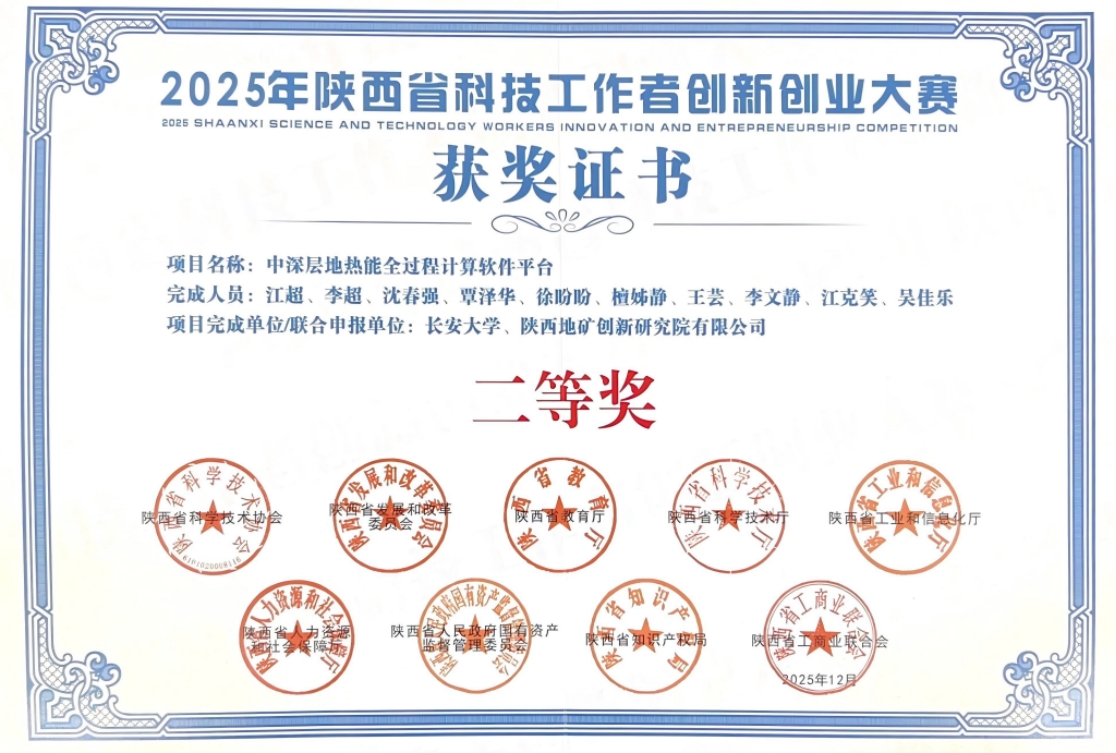 2025年11月,陕西省科技工作者创新创业大赛在西安举办。beat365在线唯一官网青年教师李超作为第二参与人,与建筑工程学院江超老师主持完成的《中深层地热能全过程计算软件平台》荣获二等奖。