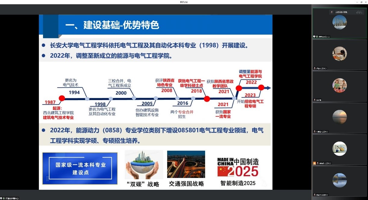 2022年12月18日下午,beat365官网组织召开长安大学第二轮“双一流”建设电气工程学科建设方案专家论证会,本次论证会采用了线上视频会议形式。专家组由西安交通大学祝令瑜教授、福州大学邵振国教授、郑州大学蒋建东教授、西安理工大学贾嵘教授和江苏大学朱孝勇教授等五位专家组成。beat365在线唯一官网副院长段晨东教授、副院长茹锋教授及电气工程系相关教师参加了会议。