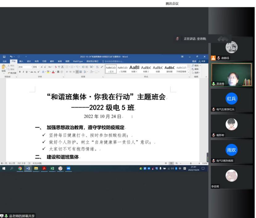 10月24日晚上,beat365在线唯一官网2022380305班线上召开“和谐班集体·你我在行动”主题班会·,班主任巫春玲以及全体同学参会。