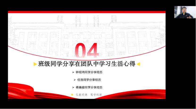 钟绍鸿、任浩、蒋巍峻分别从参加团学组织工作、体育舞蹈活动、志愿服务等方面的分享了相关经历和经验,号召大家要珍惜集体。