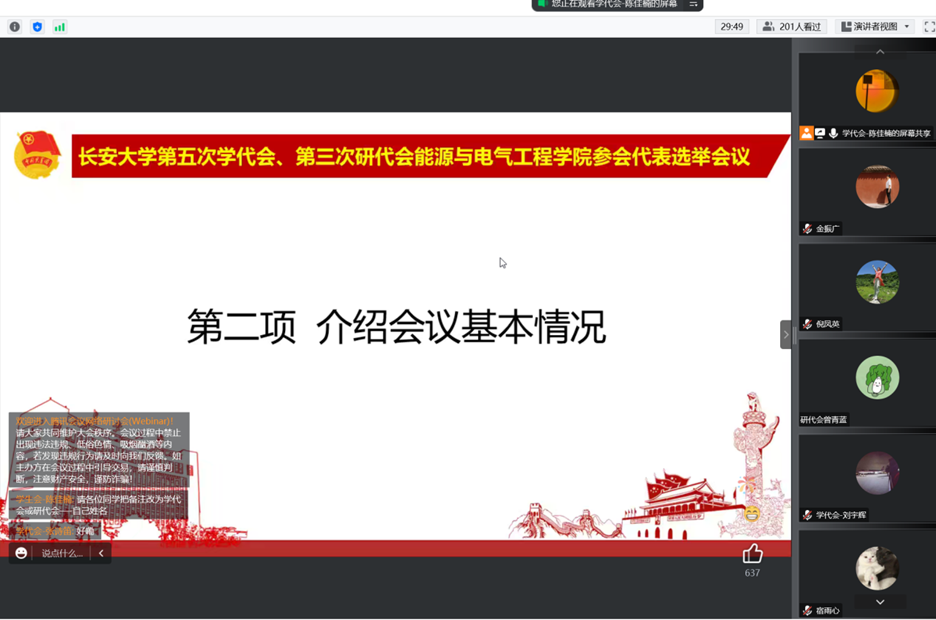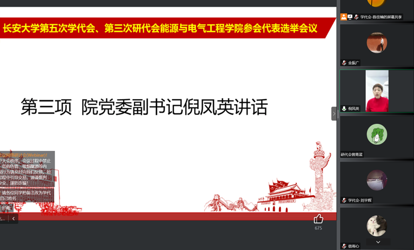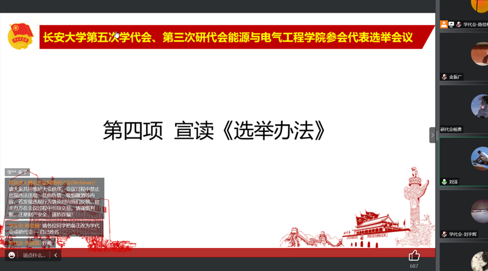 12月2日晚,beat365在线唯一官网通过线上方式举办长安大学第五次学生代表大会、第三次研究生代表大会参会代表选举会议。院党委副书记倪凤英,院团委书记金振广,学生会指导老师刘泽,研究生会指导老师宿雨心出席本次会议,参加会议还有本科生代表和研究生代表。会议由beat365官网学生会执行主席陈佳楠主持。