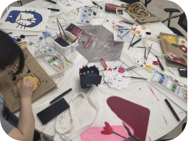 活动中,同学们积极投入创作,专注于绘制。他们或在帆布袋上恣意挥毫,用天马行空的笔触勾勒出想象中的图案;或以饱满的色彩,寄托对未来的祝福;或另辟蹊径,以独特的元素描绘人物肖像;或工笔入画,山水之间点缀出生活的情趣。当然更有母亲节对母爱的深深感激。同学们自由地描绘所想所感,创造属于自己的作品。不止于此,活动中大家热情交流,讨论彼此画作的技巧与构思,充分融入欢快的活动氛围。