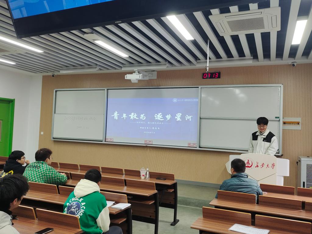 在许桂敏老师对本次班会的主题与目的进行说明并对高志飞同学的情况做简要介绍后,高志飞以“青年敢为,逐梦星河”为题,从课程学习、科研竞赛、社会实践、学生工作和大学生活五个方面,分享了他的经验与心得,鼓励大家不仅要扎实学业,还要精于时间管理,勇敢追求梦想,发掘新的兴趣,与同学建立深厚的友谊,培养健康的生活习惯,以及在压力下寻找内心平静与生活平衡。高志飞学长真诚倾囊相授,为学弟学妹们传递了满满的干货和正能量。