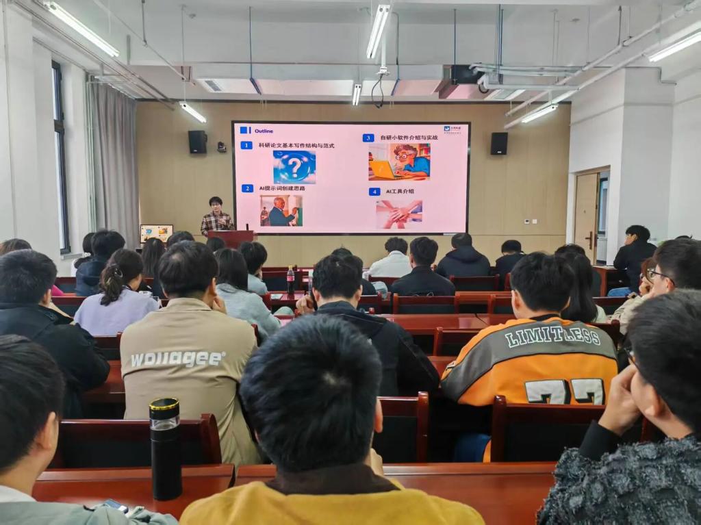 在随后的主讲环节,温大尉为在场师生带来了一场内容丰富、实操性强的知识盛宴。他首先系统梳理了学术论文的分类与核心框架,并着重针对摘要、引言和结论等关键部分的撰写技巧进行了深入剖析。他结合实例,讲解了如何使摘要更精炼、引言更引人入胜、结论更富有见地,让听众对高质量论文的写作范式有了更清晰的认识。随后他介绍了几款在论文写作不同环节能提供助力的AI工具,并着重引导大家如何“正确使用”。他强调,AI工具是辅助研究的“得力助手”而非“代笔枪手”,其最终目的是解放研究者的创造力,提升工作效率,而绝非替代深入的思考与严谨的论证。他呼吁全体师生在利用AI工具的同时,必须坚守学术诚信的底线,确保研究成果的真实性与原创性。