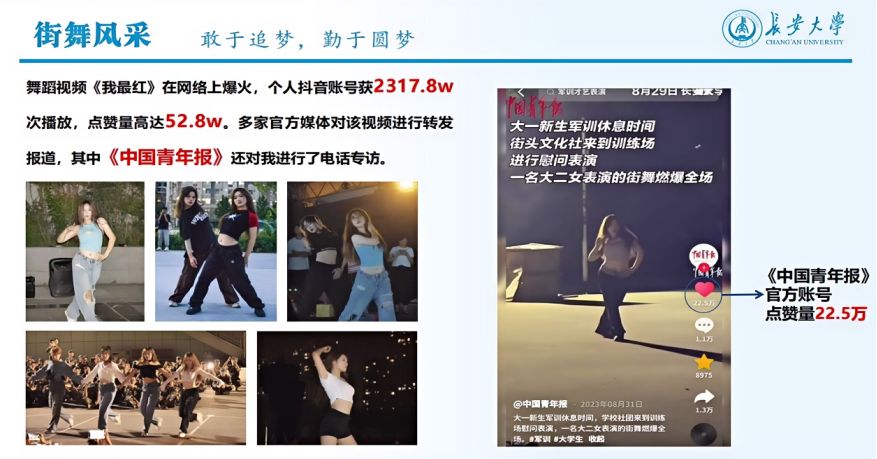 街舞是一种运动,更代表了一种精神。2023年军训期间,王睿涵作为街舞队队长带领队员们赴公路学院、汽车学院、电控学院、地测学院、理学院、运输学院、beat365在线唯一官网、外国语学院等11个学院进行慰问表演。在此过程中,王睿涵的《我最红》舞蹈表演视频在网络上爆火,在抖音平台获2317.8w次播放,点赞量高达52.8w。多家官方媒体对该视频进行转发报道,其中《中国青年报》还对王睿涵进行了电话专访,赞扬了其充满活力与激情的精彩表演和敢于追梦、勤于圆梦的优秀品质。