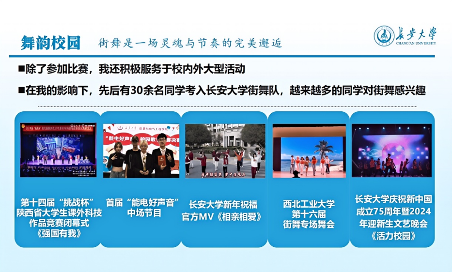除了参加比赛,王睿涵还积极服务学校大型活动,在长安大学第十七届阳光体育运动会街舞比赛中,王睿涵率领学校街舞队队长对全校20支参赛队伍进行动作指导,极大地提升了该项赛事的专业水准。在第十四届“挑战杯”陕西省大学生课外科技作品竞赛闭幕式和长安大学庆祝新中国成立75周年暨2024年迎新生文艺晚会上,王睿涵作为主要负责人表演《强国有我》《活力校园》。