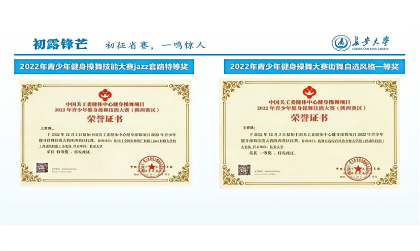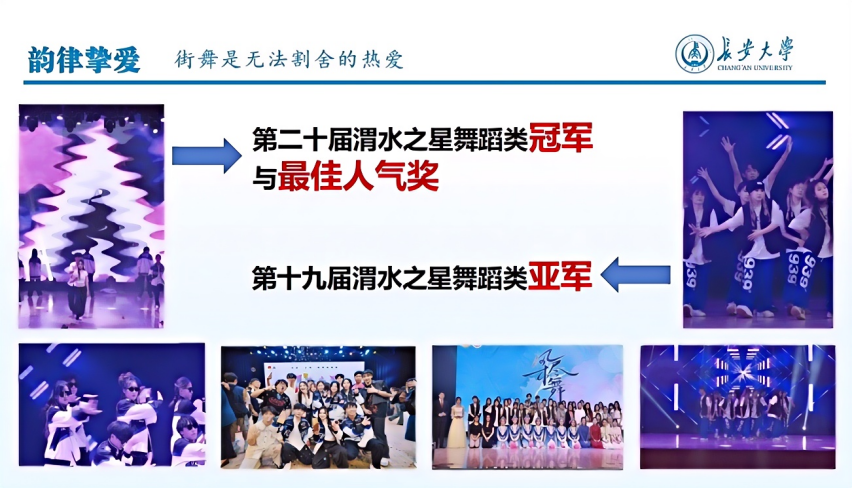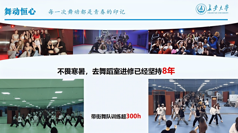 2023年6月,面对即将到来的陕西省大学生健美操艺术体操啦啦操街舞及校园健身操舞锦标赛,作为新任的长安大学街舞队队长,王睿涵带领学校街舞队刻苦排练,最终获得此次锦标赛Hip-hop套路第一名,同时还斩获了锦标赛自编套路第三名的好成绩。此后在她的带领下,长安大学街舞队陆续斩获了2023年陕西省街舞公开赛团体齐舞(高校组)二等奖、2024年陕西省街舞公开赛亚军等省级奖项。