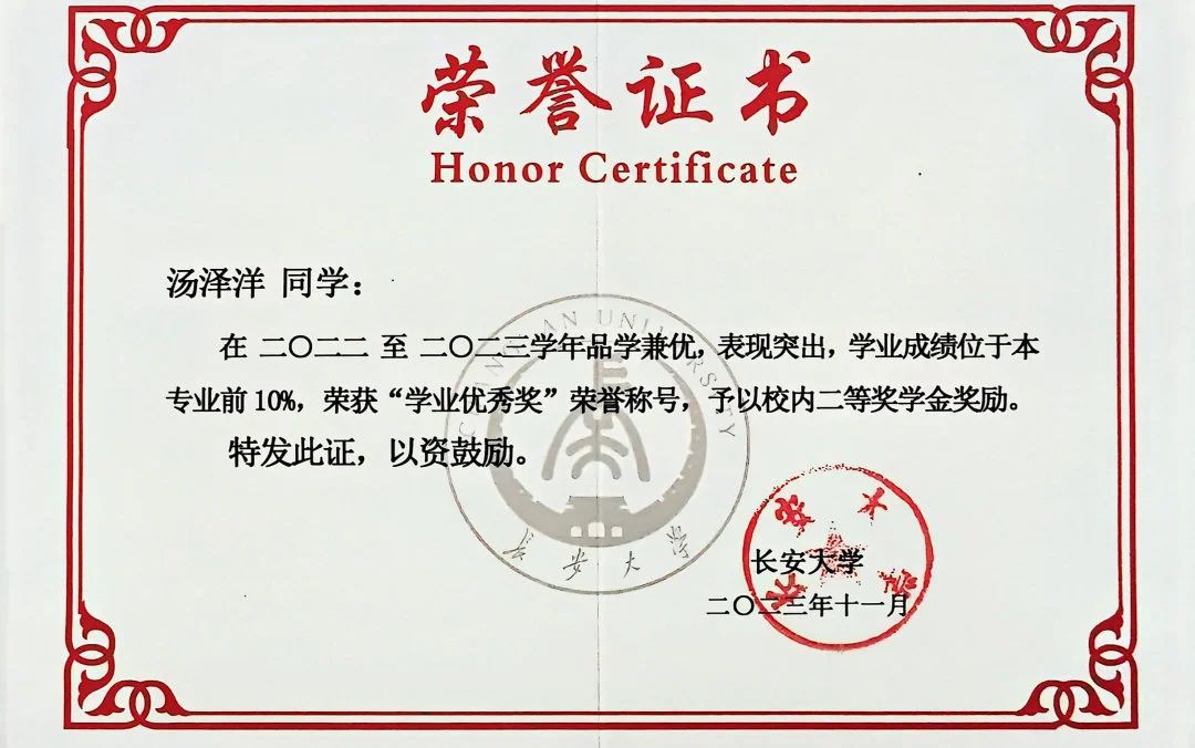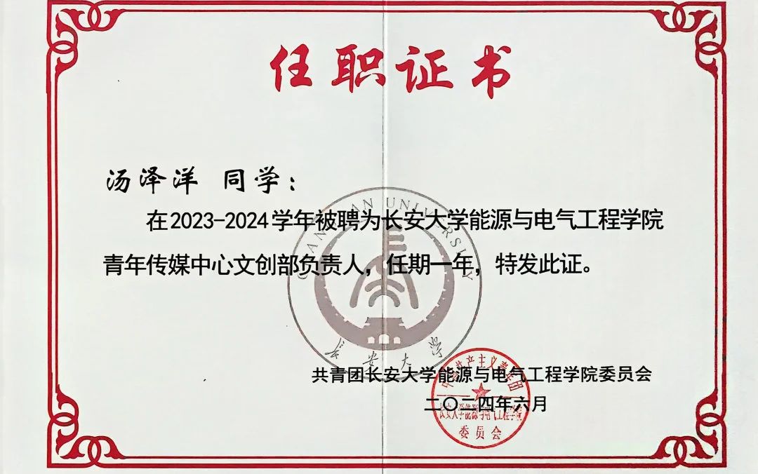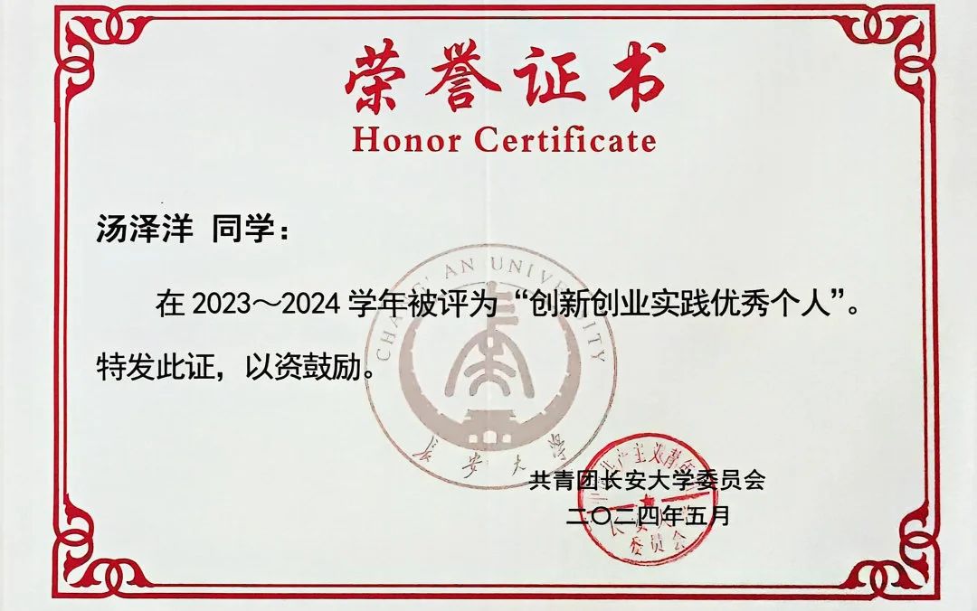 汤泽洋,男,中共预备党员,beat365在线唯一官网电气工程及其自动化专业2022级本科生,2023-2024学年长大·卓越奖·双创之星获得者。他连续两年综合成绩排名专业第一,连续两年获得国家奖学金,获10余项奖学金,累计奖学金金额30000余元;广泛参加创新创业竞赛,荣获国家级奖项3项,省部级奖项8项,校级奖项20余项,项目资金累计20000元,获长安大学创新创业实践优秀个人等荣誉称号3项。
