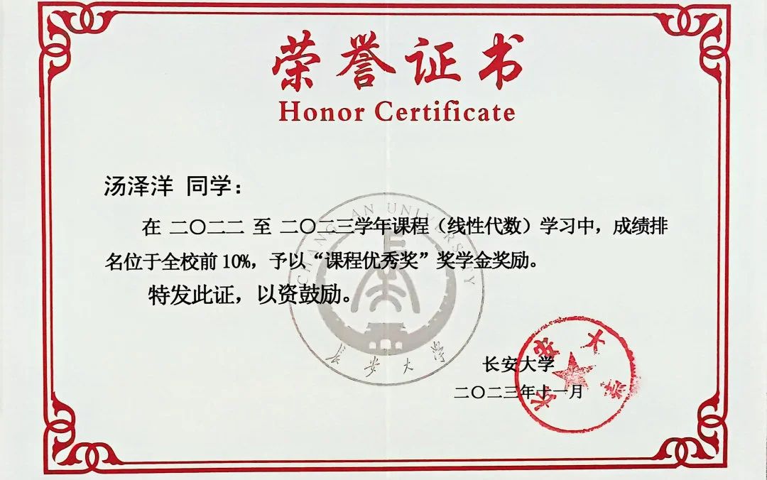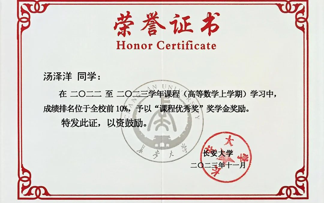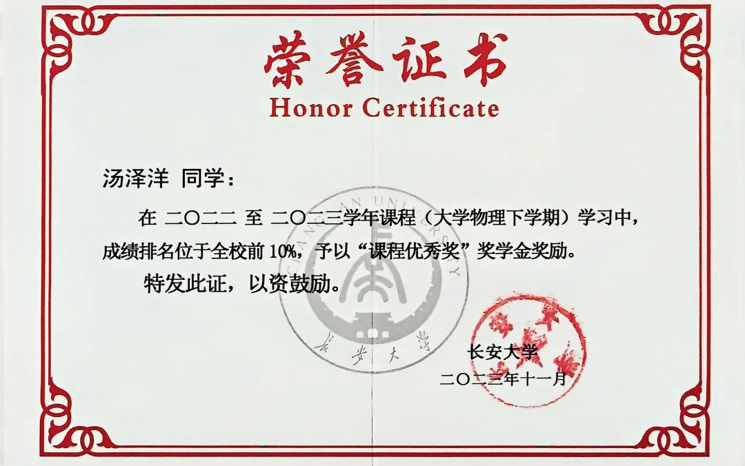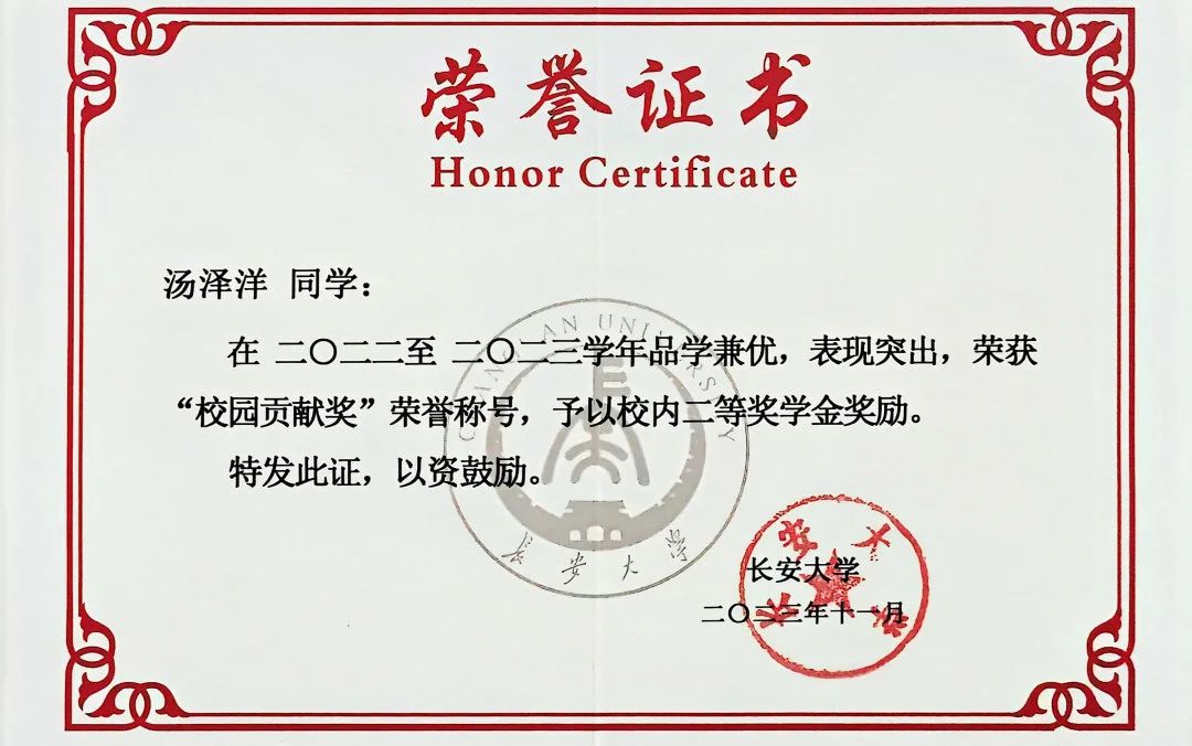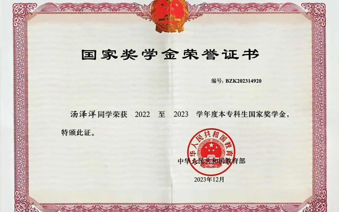 不经一番寒彻骨,怎得梅花扑鼻香。自入学以来,他始终以高标准严格要求自己,坚持“每天列计划,每周看进度,每月做总结”,追求以更高的效率利用好有限的时间。两年时间里,汤泽洋有27门课程总评在90分以上,不仅连续两年荣获“国家奖学金”,同时获得学业优秀奖、校园贡献奖、课程优秀奖等9项奖学金,累计金额超30000元。