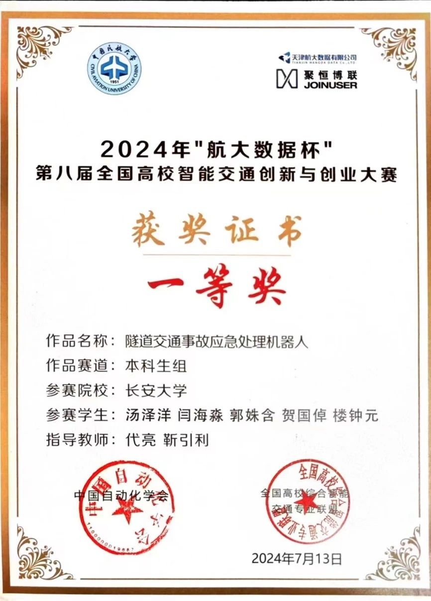 在隧道交通事故应急处理机器人项目开发过程中,汤泽洋和团队专注于隧道次生事故的应急处理,旨在建立一套全面的运行监测管理体系。该机器人集成了远程通信、可视化控制、定位、图传及图像识别等功能,有效提升了预防二次事故的能力。凭借此项目,汤泽洋带领团队在第八届全国高校智能交通创新与创业大赛中荣获国家级一等奖。