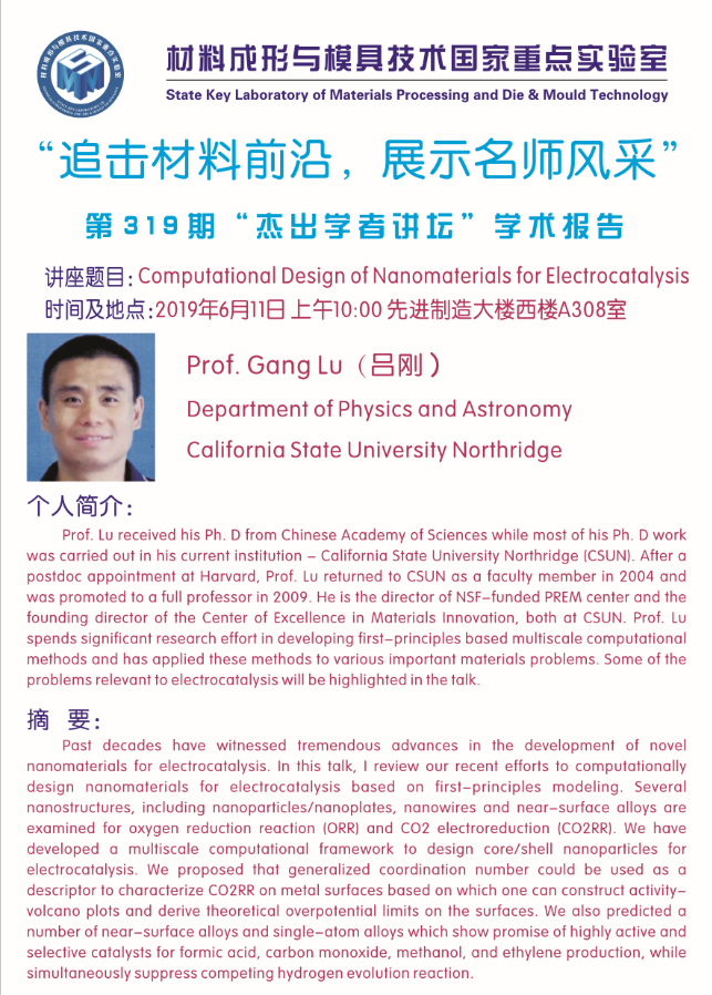 第319期杰出学者讲坛——California State University Northridge Prof. Gang Lu(吕刚)